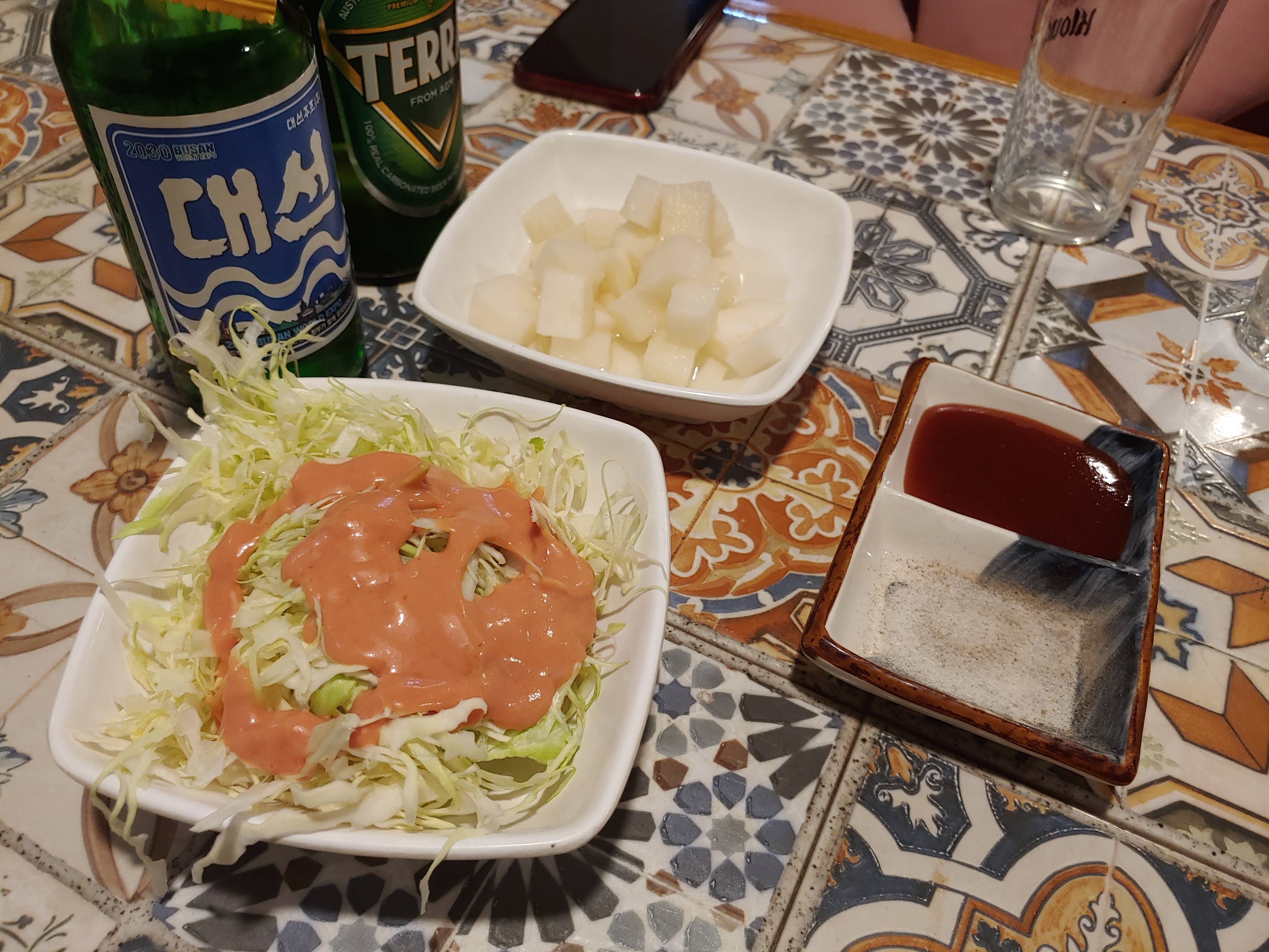 옛날통닭집 특유의 양배추 샐러드, 치킨무, 그리고 소금과 양념소스가 먼저 등장한다. 옛날통닭집에는 특히 저 양배추 샐러드가 없으면 정말 아쉽다.